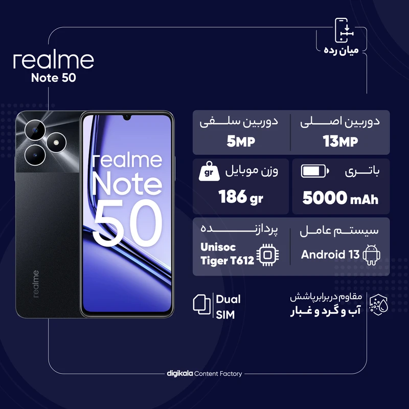 اگر در زمینه گوشی‌های اقتصادی کمی تحقیق کنید متوجه می‌شوید که ریلمی همواره گزینه‌هایی را برای ارائه در این بخش دارد. گوشی موبایل ریلمی مدل Note 50 هم یک مدل اقتصادی است که برای کسانی که استفاده سنگینی از گوشی ندارند و به طبع نمی‌خواهند هزینه زیادی را انجام دهند طراحی شده است و می‌توان گفت در این کار عملکرد خوبی داشته است. این گوشی طراحی خوبی دارد و از وزن سبکی بهره می‌برد. نمایشگر IPS آن قابل قبول است و با داشتن نرخ نوسازی 90 هرتز تجربه روان‌ای با آن خواهید داشت. در بخش دوربین هم با داشتن دو دوربین اصلی می‌توانید انتظاری در حد قیمت و شاید هم کمی بهتر را داشته باشید. همچنین پردازنده Unisoc T612 و باتری 5000 میلی‌آمپرساعتی این گوشی برای کارهای معمول و روزمره کاملا جوابگو و کاربردی است و به صورت کلی می‌توان گفت این گوشی ارزش بالایی را نسبت به قیمت ارائه می‌دهد.
